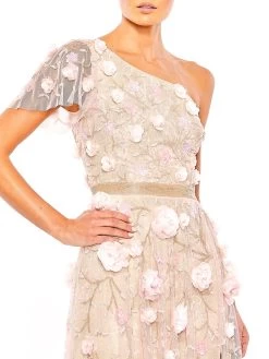 Accented floral appliqué, Mac Duggal’s A-line gown features a one-shoulder neckline with a single short sleeve, banded waist, and front thigh slit.