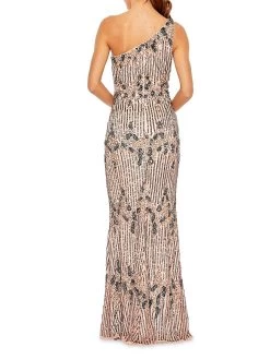 Mac Duggal’s glittering sequin-embellished gown is crafted of mesh and features a one-shoulder neck.