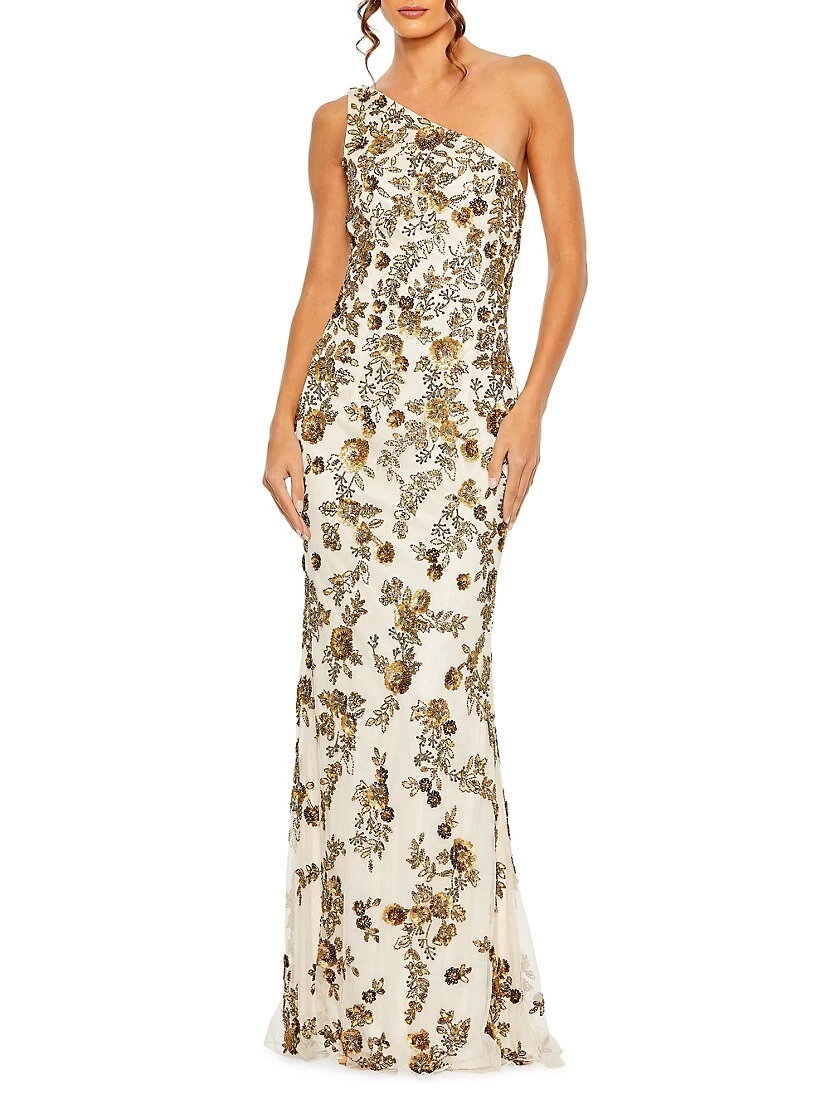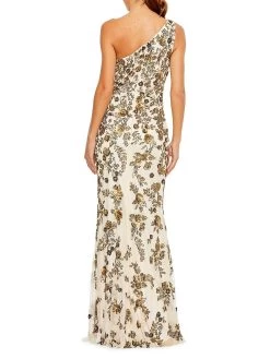 Mac Duggal’s asymmetric gown is crafted of mesh. This floral-beaded style features a one-shoulder neck and a floor-sweeping hem.