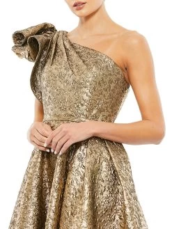 Dramatic ruffle detailing and a pleated, full skirt add elegance to this metallic dress.