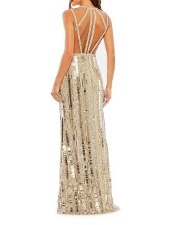 Mac Duggal’s fitted gown is covered with dazzling beaded embellishments. This glamorous style features a halterneck, strappy open back, and an elongating thigh-high slit.