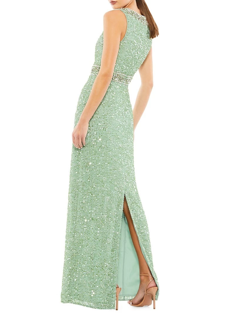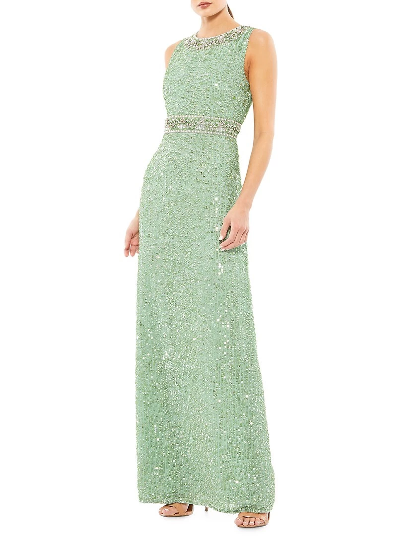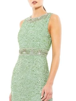 This sleeveless column gown by Mac Duggal is detailed with sparkling beaded embroidery.
