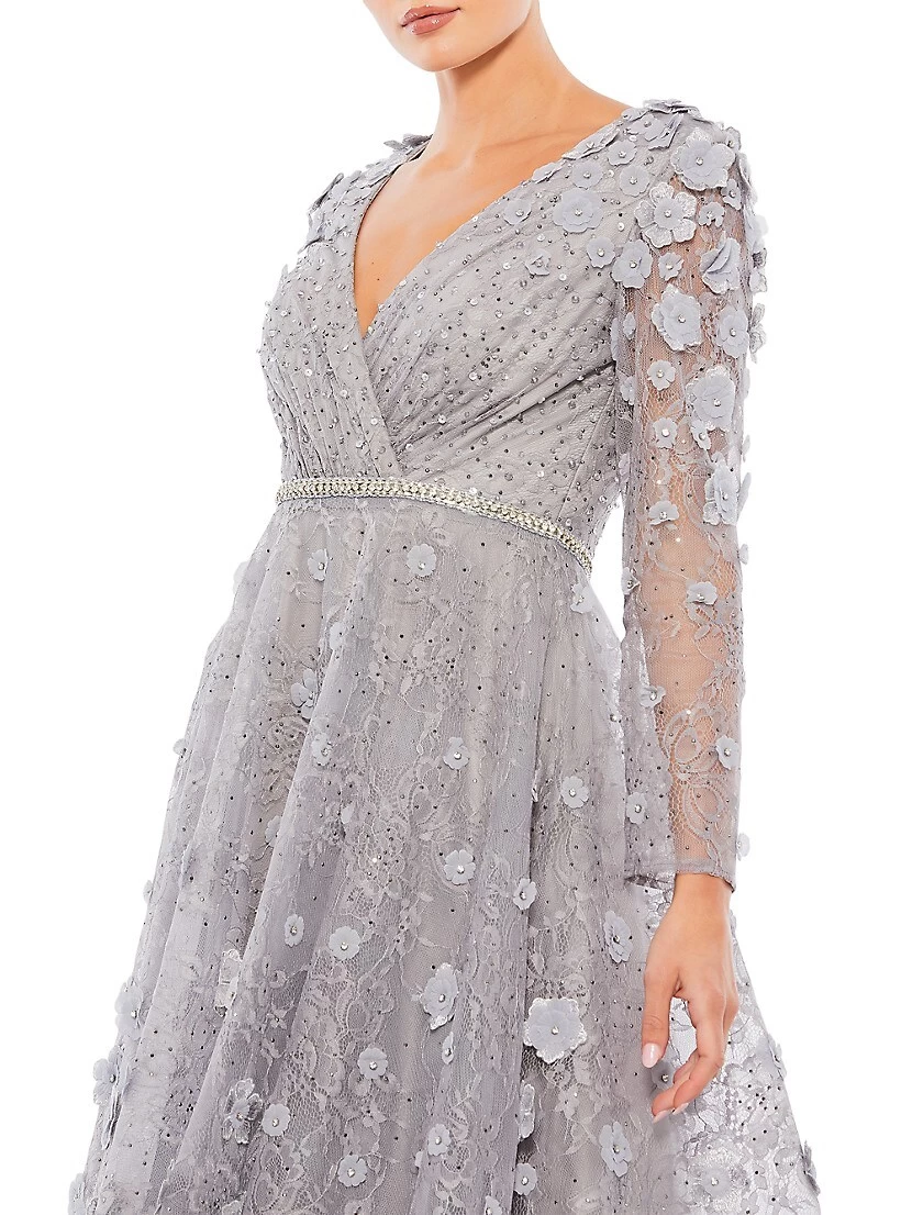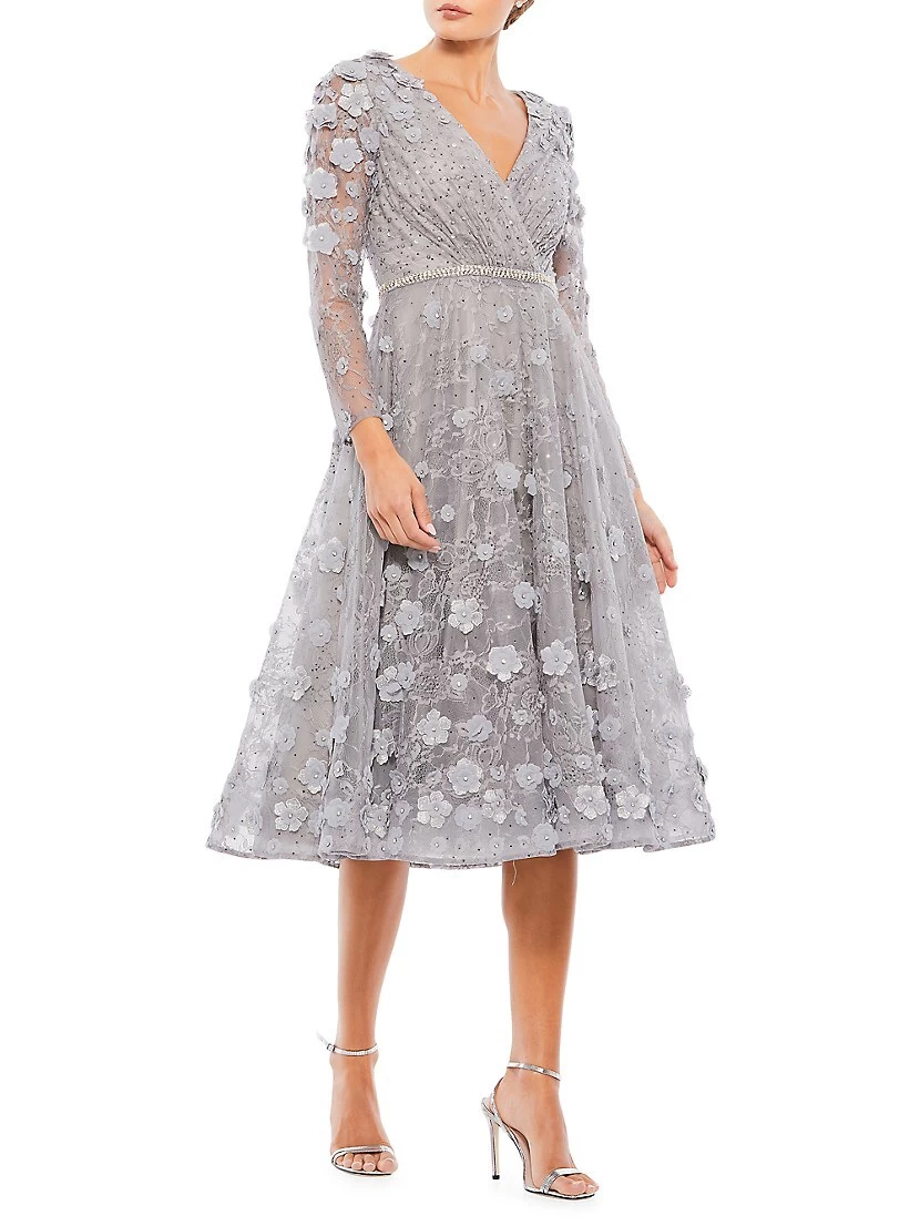 Crafted of sheer netted lace embellished with beads, crystals, and floral appliqués, this mid-length dress is styled with a wrapped V-neck and full circle skirt.