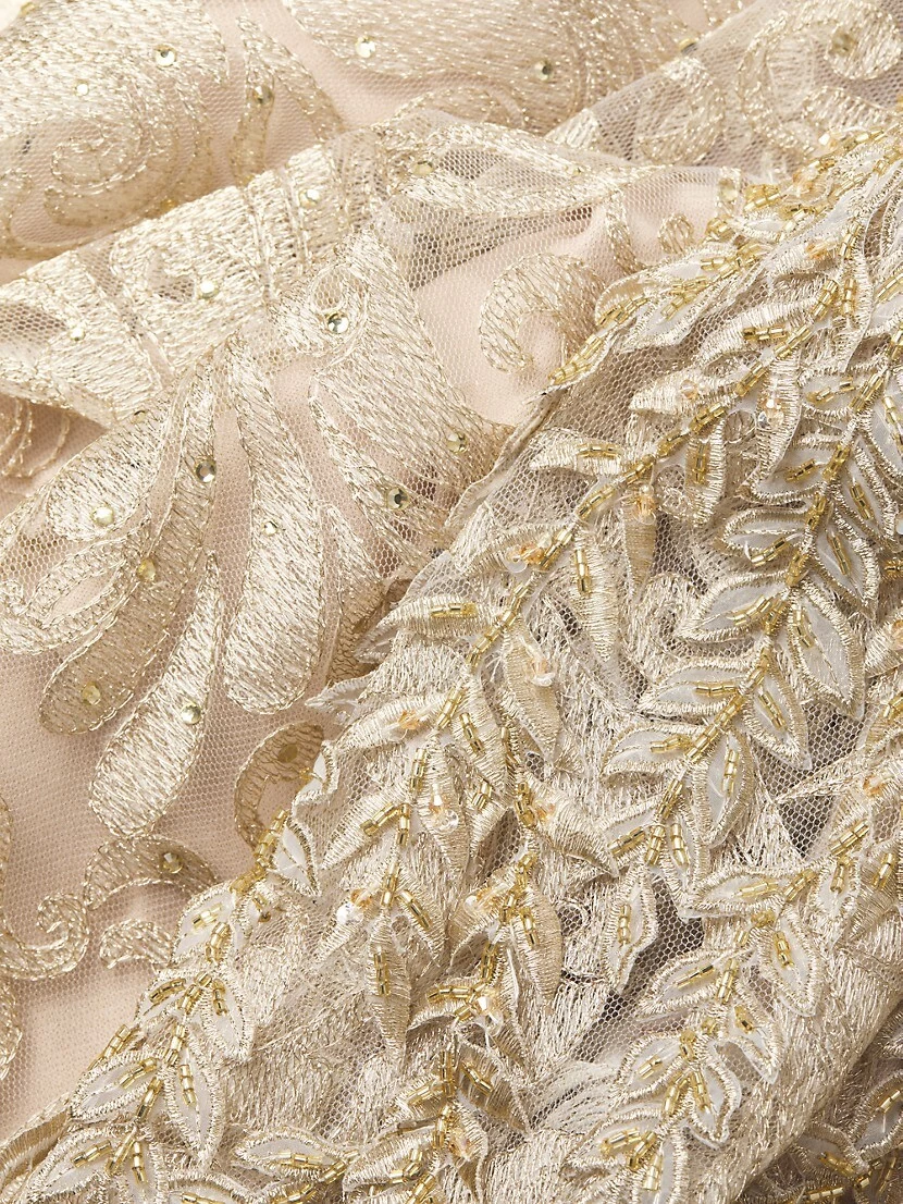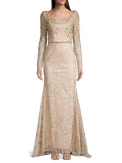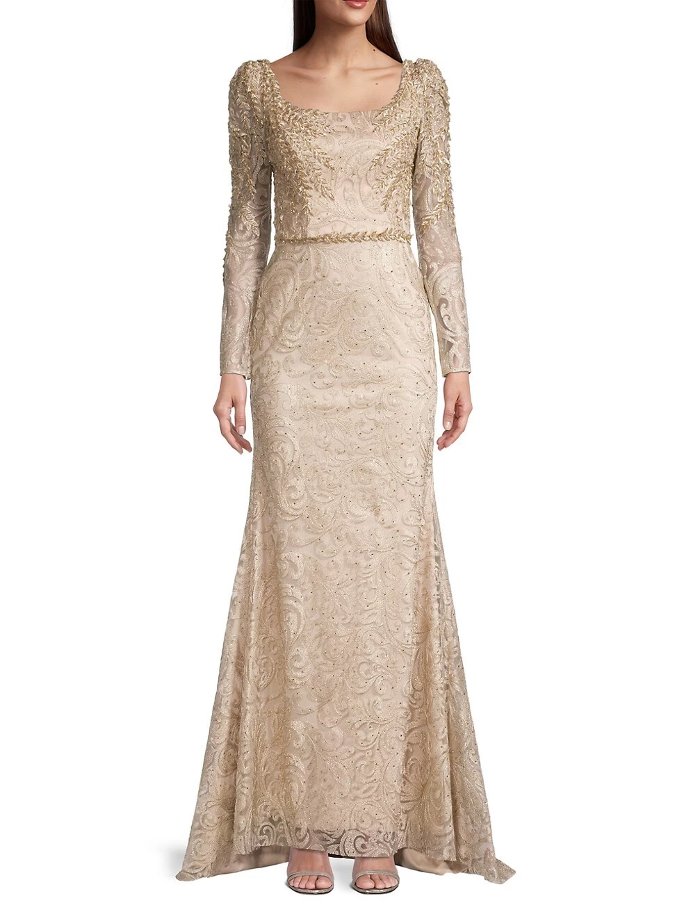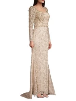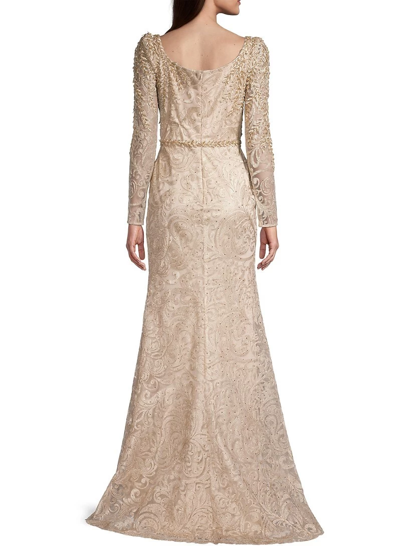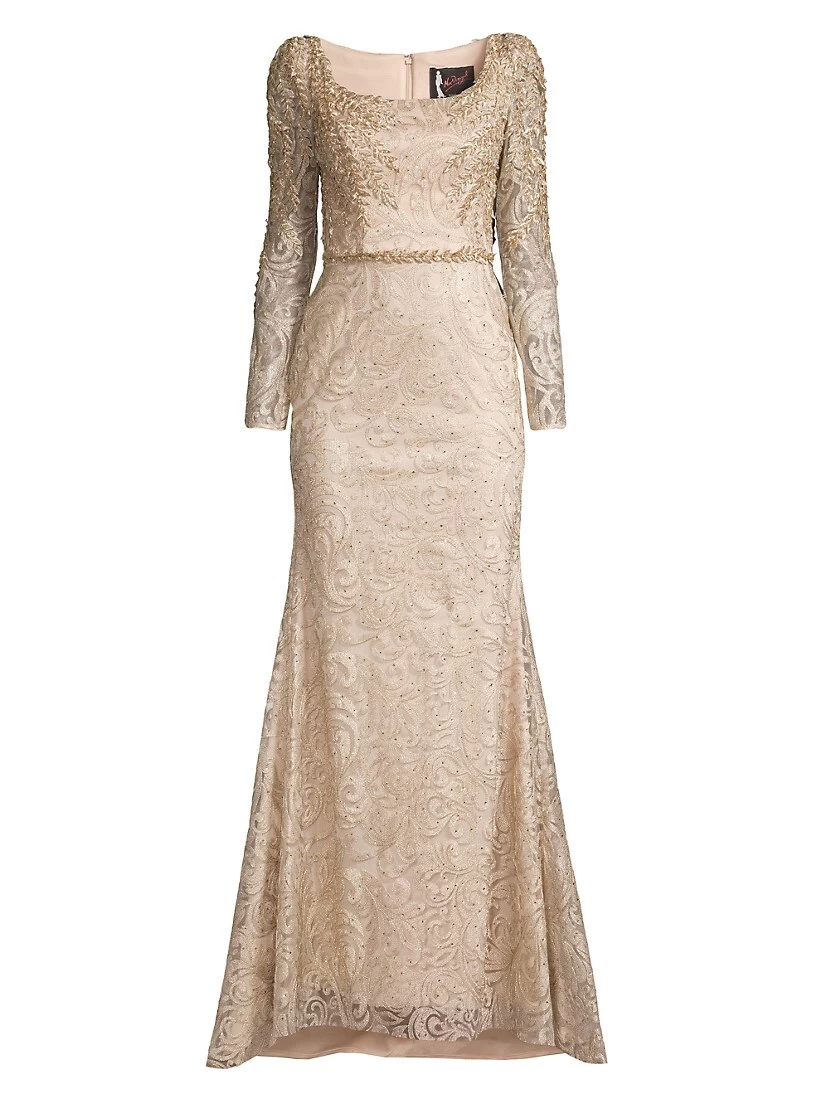 Beading adds shine to this elegant lace gown, featuring a pooled back hem.