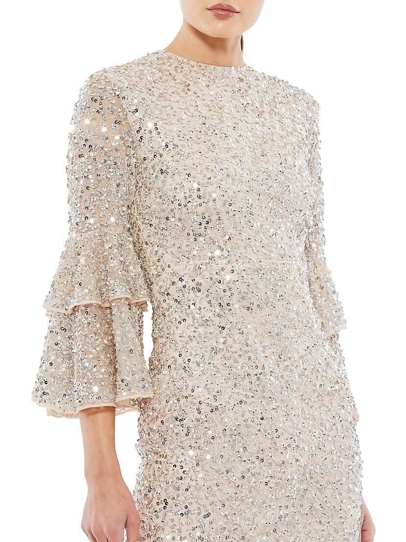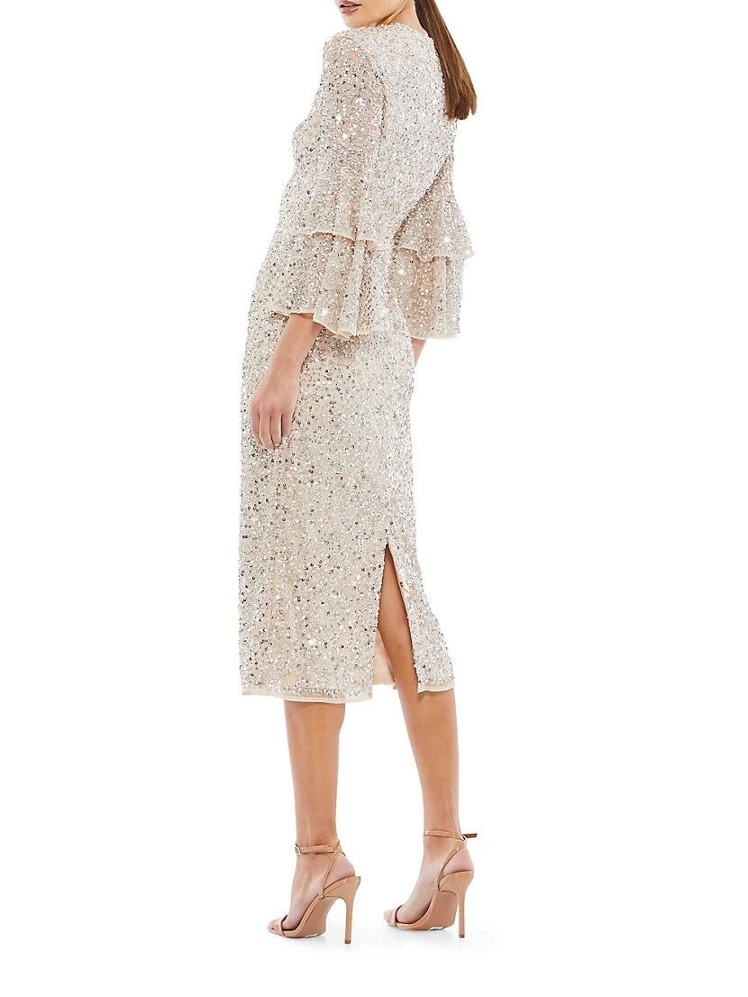Bead-embellished A-line midi dress with playful tiered sleeve cuffs.