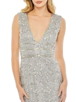 Intricate geometric beading covers Mac Duggal’s elegant sheath dress, cut to the ankle.
