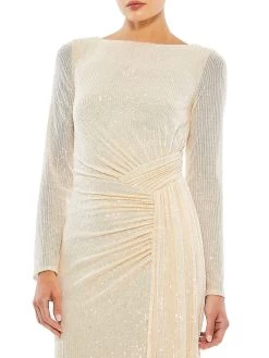 Vertical sequins embellish Mac Duggal’s column gown, designed with a gathered, draped waist.