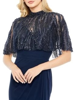 Enhanced with voluminous butterfly sleeves, Mac Duggal’s gown features intricate embroidering with hand-placed sequins at the bodie. This piece is finished with a ruched waistline that falls into a floor-length skirt.