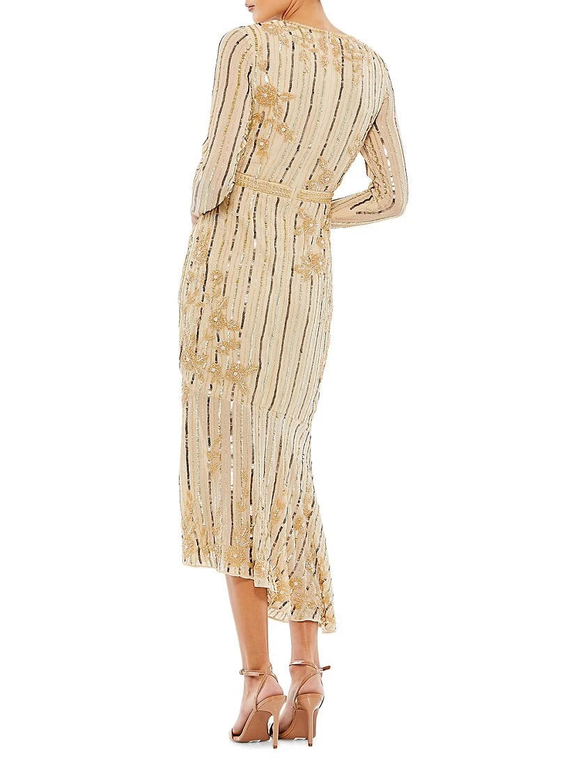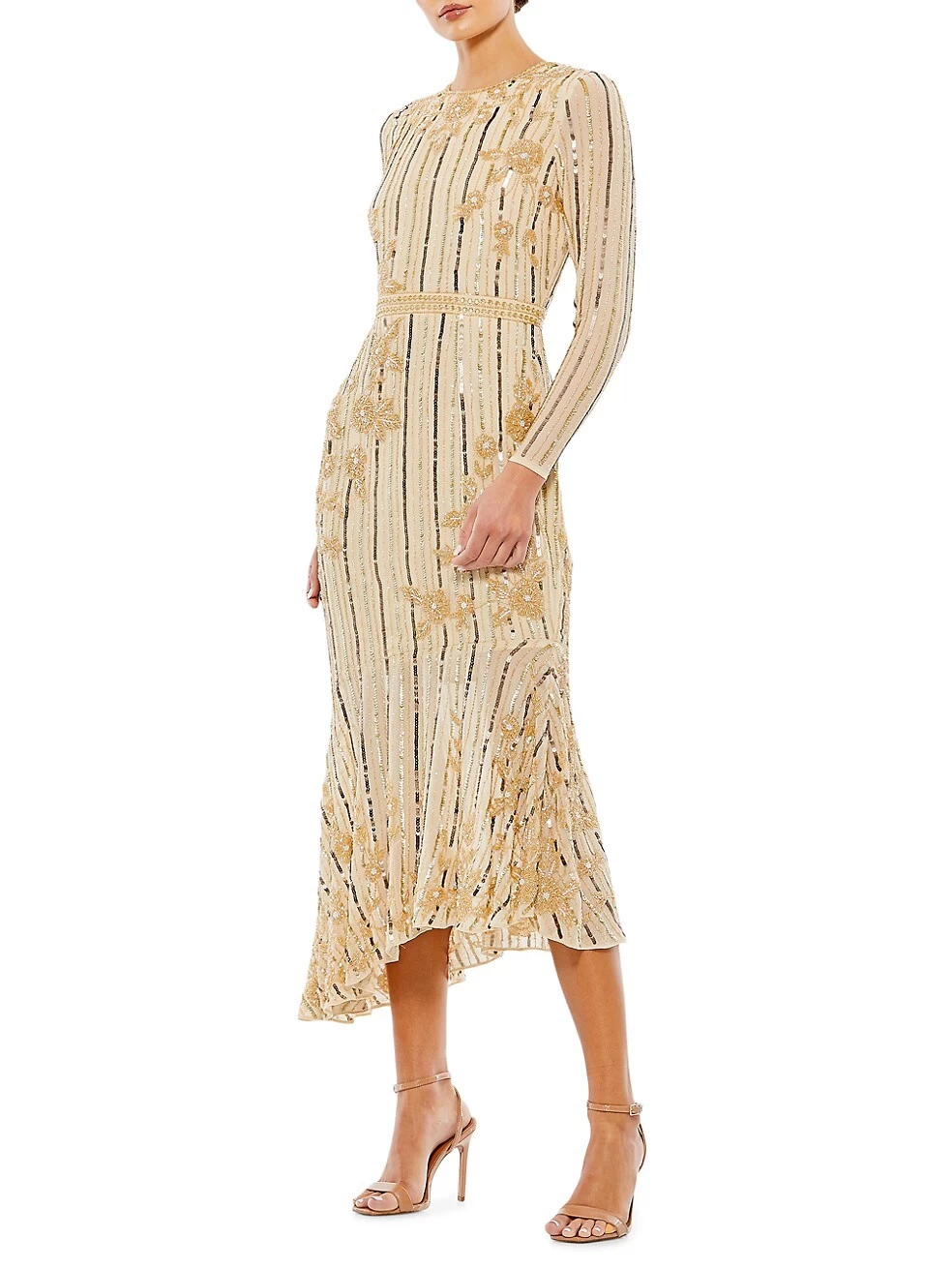 This Mac Duggal mid-dress features a fitted, long-sleeve silhouette with an asymmetric fishtail hem. Sparkling rhinestones, beads, and sequins elevate the look.