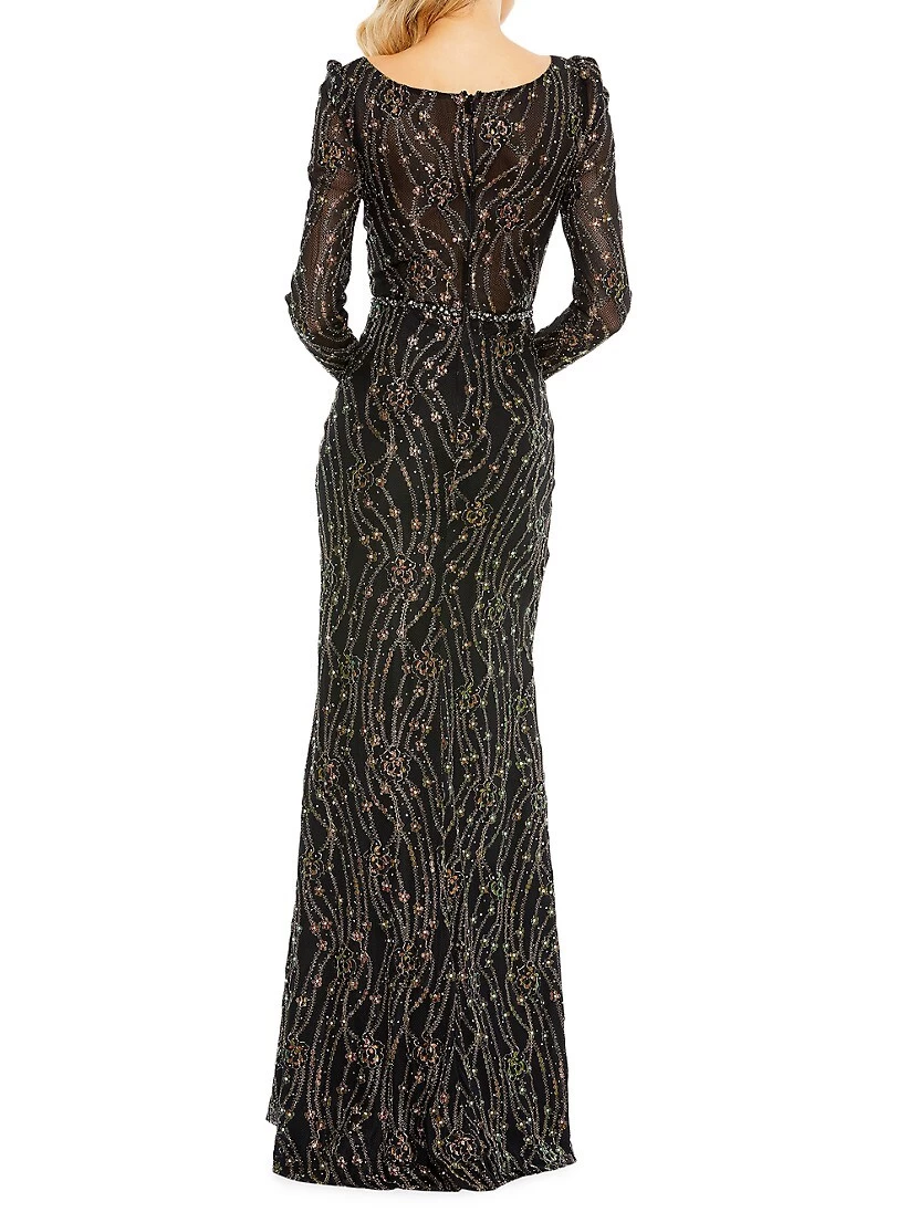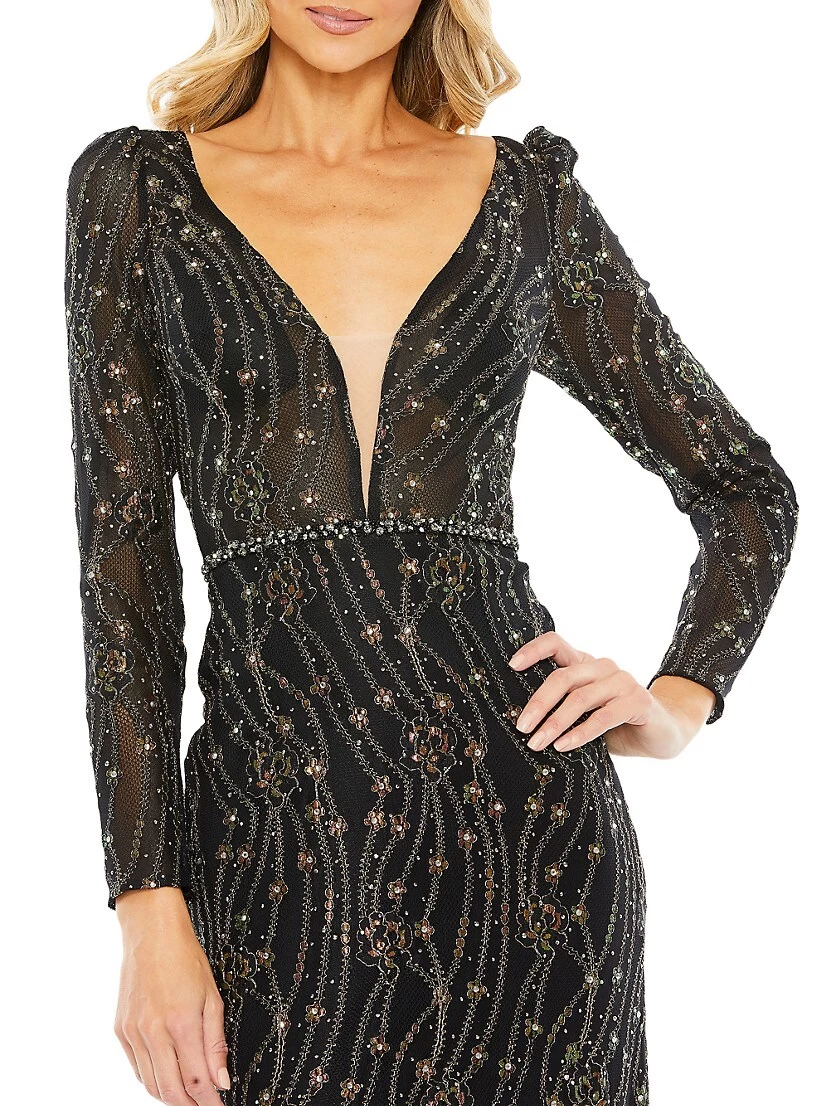 Featuring rhinestone embellishments and floral embroidery, Mac Duggal’s mesh trumpet gown showcases a plunging V-neck and princess sleeves.