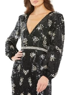 Flaunting voluminous bishop sleeves and a flattering V-neck, Mac Duggal’s fit and flare dress is rendered in sparkling sequins with lustrous floral-shaped crystals.