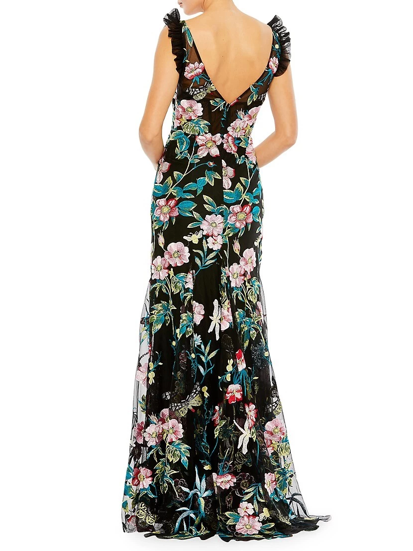 This chic floral gown from Mac Duggal is styled with a plunging neckline in a trumpet silhouette.
