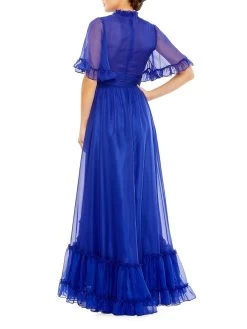 From the Evening collection. This dramatic Mac Duggal gown is tailored with a striking high neck, evened out with a chic high-low hem. Framed by sheer short sleeves, this charming piece ends in tiered ruffles.