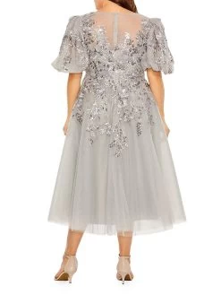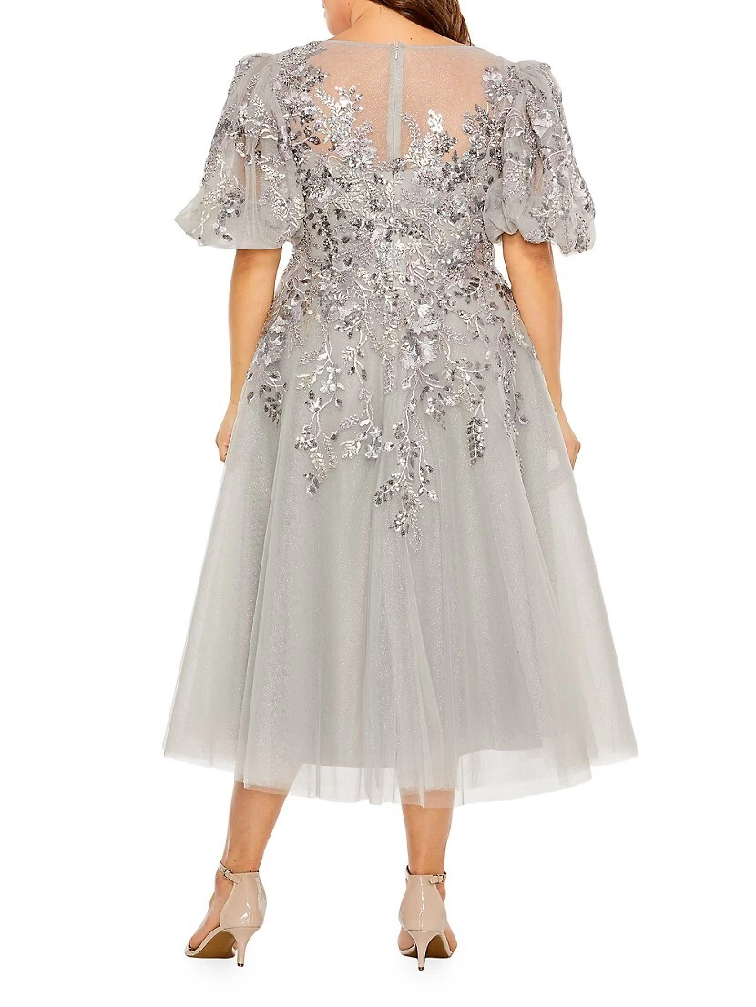 From the Fabulouss Collection. Mac Duggal’s midi-dress is crafted of glittering tulle. This style features a round neck, short puff sleeves, and intricate beaded embellishments.