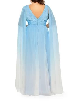 From the Fabulouss Collection. Crafted of chiffon, Mac Duggal’s ombré gown features a V-neck, capelet sleeves, and a thigh-high slit.