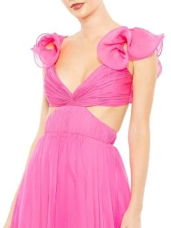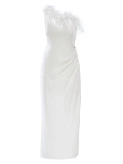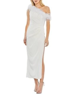 Mac Duggal’s elegant one-shoulder dress flaunts beautiful feather trim and a side slit detail.