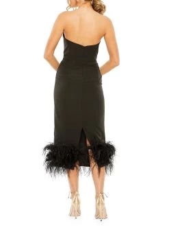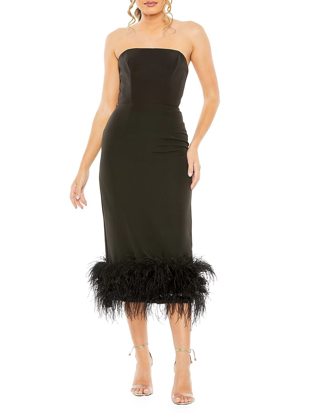 This midi-dress from Mac Duggal flaunts a strapless neckline with chic feather trim along the hem.