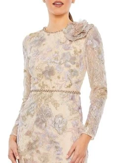 This romantic midi-length dress showcases floral appliués on a romantic lace backing, jeweled at the neck and waist.
