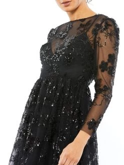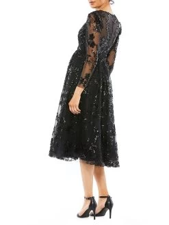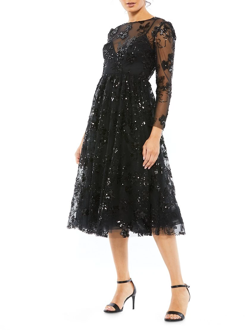 Mac Duggal’s midi-dress is defined by beaded and sequined floral patterning. Boasting a semi-sheer bodice, this style’s pleated flared skirt offers contrast.