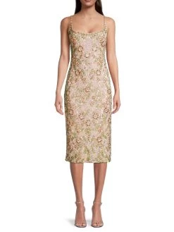 This knee-length cocktail sheath features a floral motif created with beads, sequins, and crystals embroidered on fine tulle.