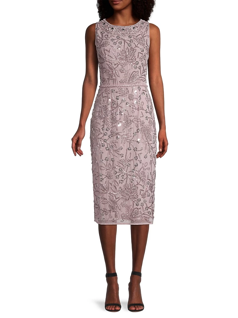 Intricately floral beaded tea length dress with standout neck and waist detailing.