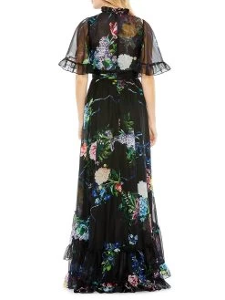 This Mac Duggal gown features an A-line silhouette crafted of floral chiffon. The look is defined by a gathered high neck, flutter sleeves, and a tiered hem.