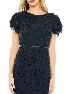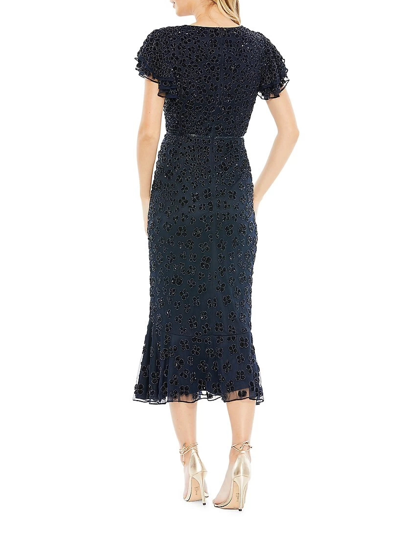 Intricate bead-embellished midi dress with feminine flutter cap sleeves and a flounce hem.