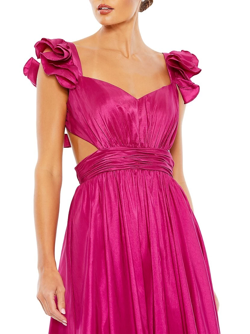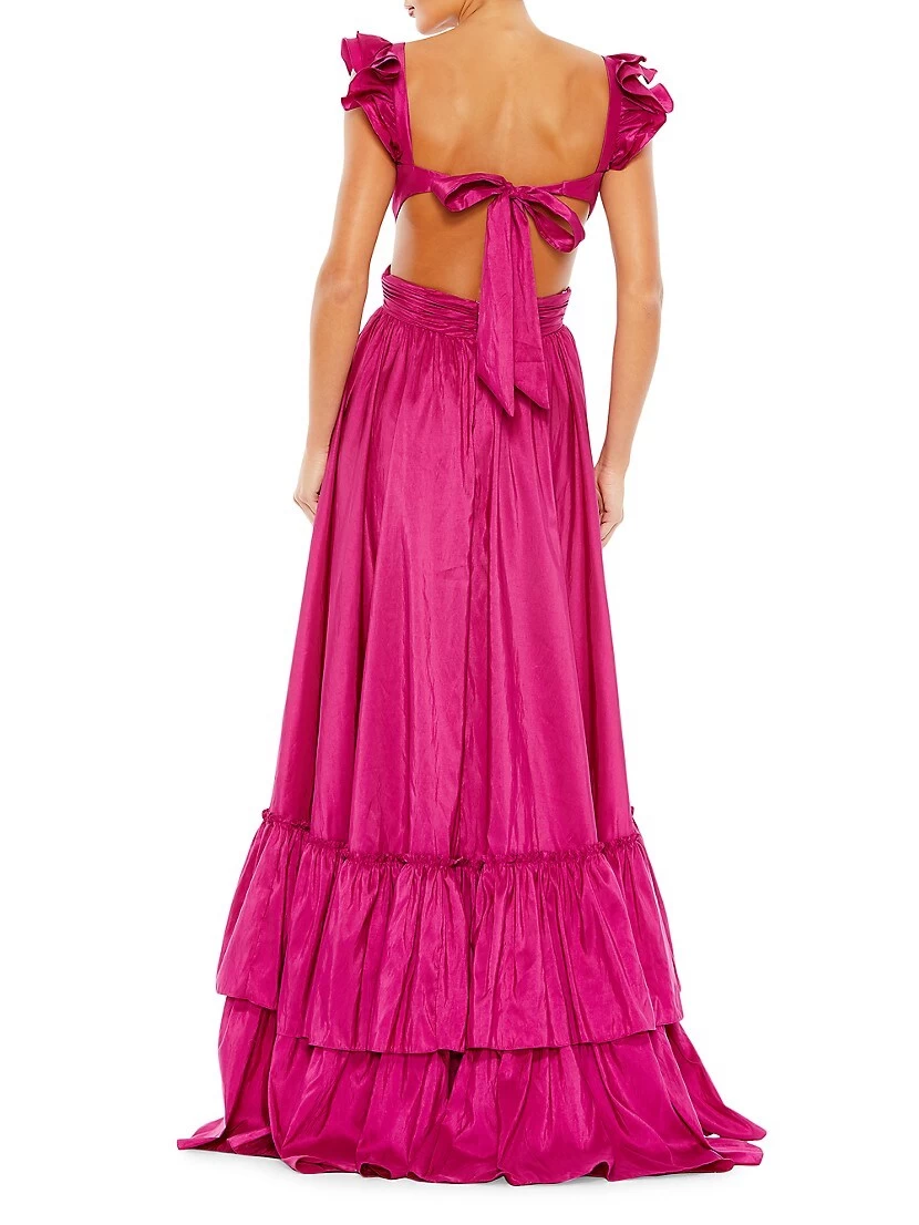 A cut-out waist and open back shape this satin gown, reminiscent of a princess dress with ruffled trim and a tiered skirt.