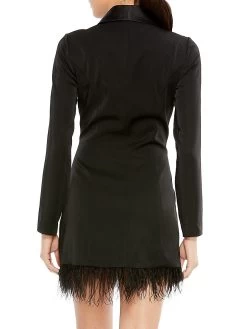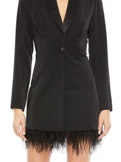 From the Ieena Collection. Tailored to a single-breasted silhouette, Mac Duggal’s mini dress features playful feather trim.