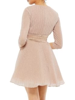 From the Ieena collection. This elegant dress by Mac Duggal is cut with a banded waist and pleated skirt in a metallic chiffon fabrication.
