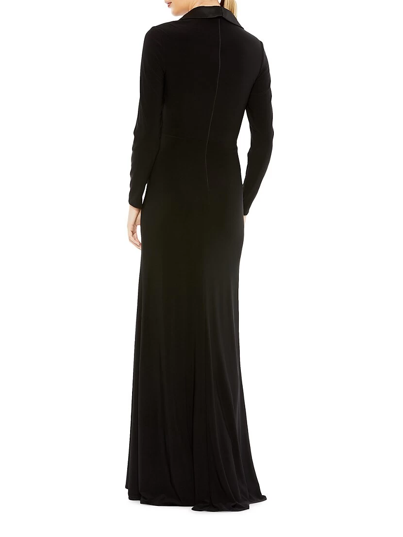 From the Ieena Collection. Mac Duggal’s sleek gown is crafted of jersey. This wrap-effect features notch lapels, long sleeves, and an elongating thigh-high slit.