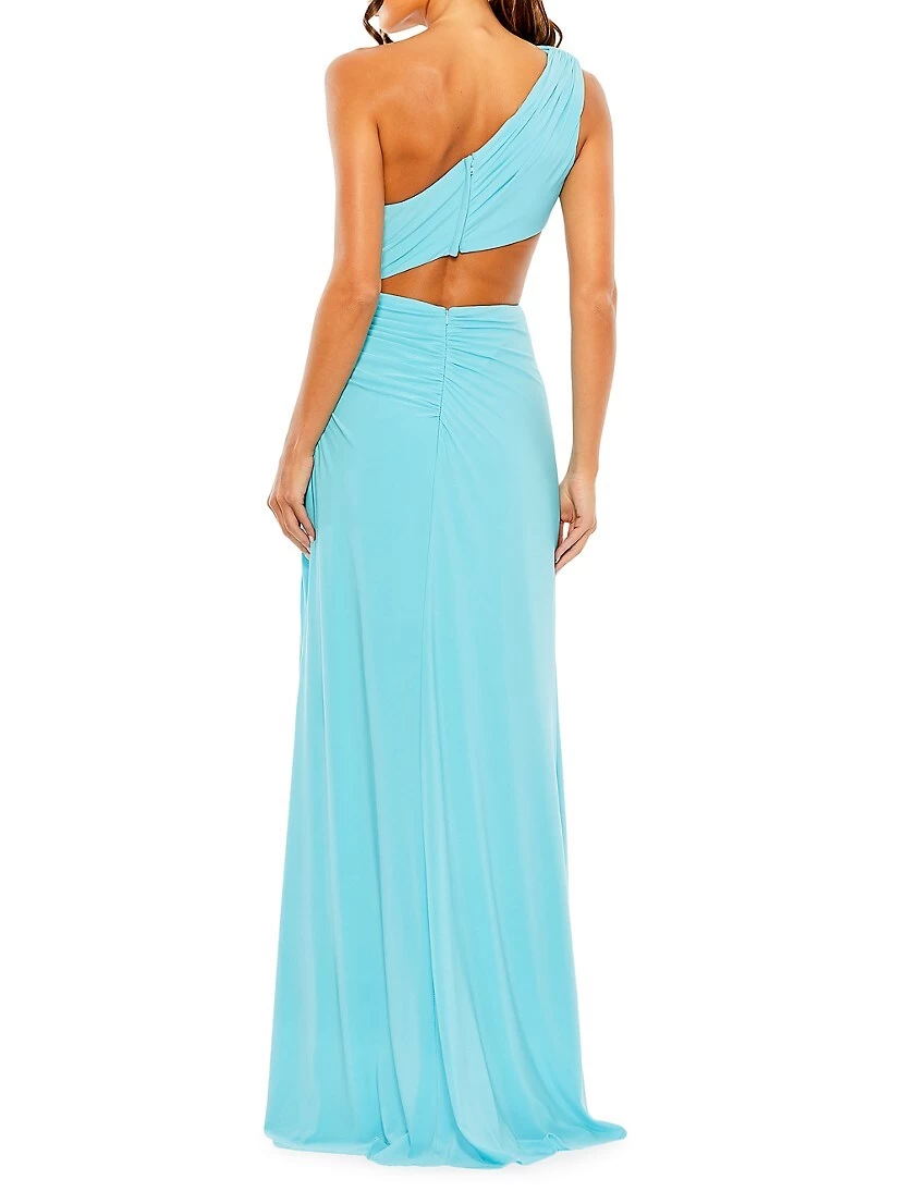 From the Ieena Collection. Mac Duggal’s stunning asymmetric gown showcases a sleek one-shoulder design and cut-out at the waist. Ruched at the back, this flowing piece features a high side slit.