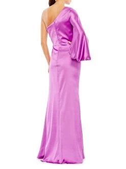 From the Ieena collection. Crafted of soft satin, Mac Duggal’s one-shoulder gown features a voluminous bishop sleeve in an elegant floor-length silhouette.