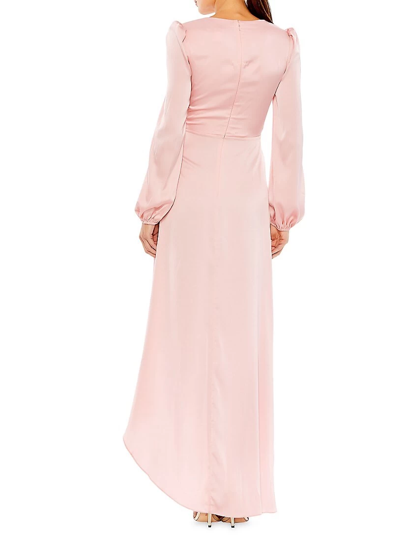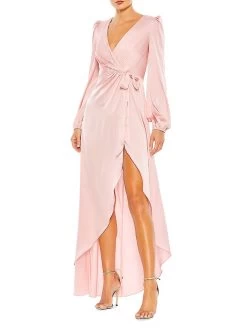 From the Ieena collection. This wrap-style gown by Mac Duggal is crafted of flowy satin fabrication with a feminine ruffle hem.