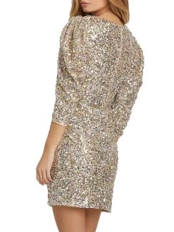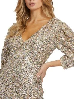 This fitted, shimmering sequined cocktail dress features three-quarter length puff sleeves.