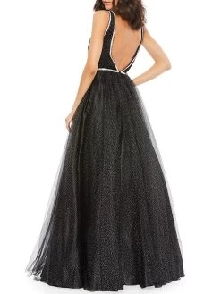 Allover shimmer adds elegance to this contrast-trimmed tulle ballgown.