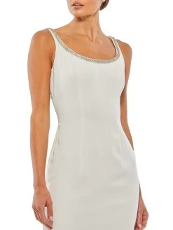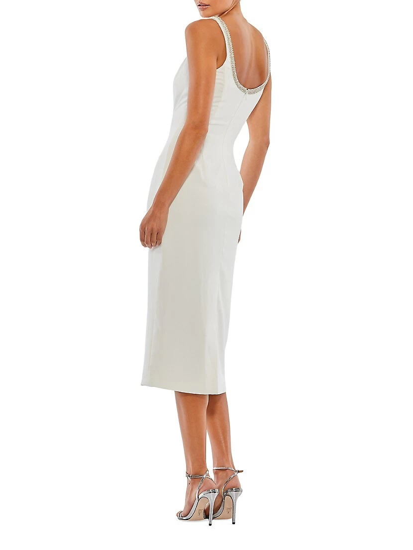 Beaded embellishing lends shine to Mac Duggal’s tailored crepe Midi-Dress.