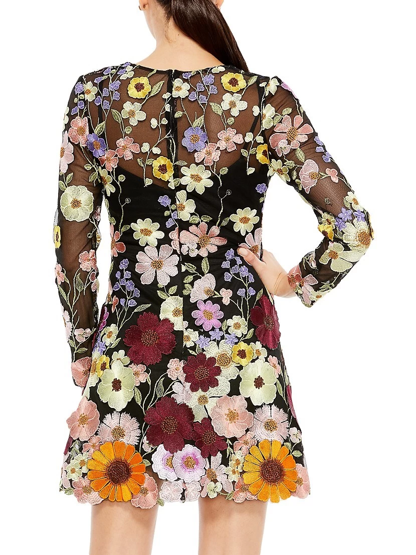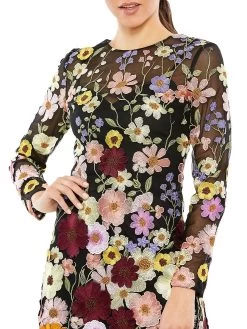 This long-sleeve minidress from Mac Duggal features an illusion sweetheart neckline and a fitted bodice embellished with a bouquet of multicolored floral appliqués.