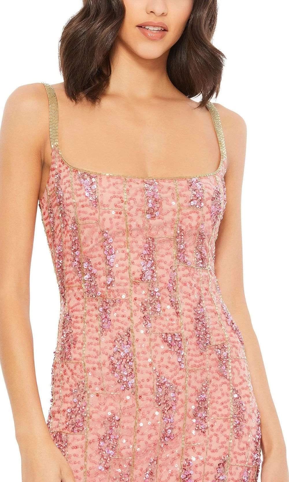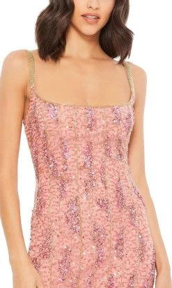 Look and feel glamorous in this dress from Mac Duggal 10696. Shows off in a sleeveless, square neckline with embellished shoulder straps. The fitted bodice flaunts a sexy open back. The fitted skirt is detailed with a center back slit. Dance all night in this dazzling dress from Mac Duggal.
