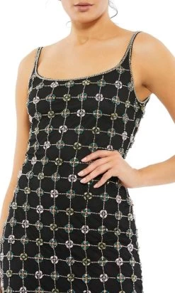 Flatter your figure with this eccentric design by Mac Duggal 10778. This ankle length gown fascinates with a unique beadwork pattern inspired by medieval chain mail, forming a grid like pattern on a sheer overlay. A delicate scoop neckline highlights the collarbone, paired with thin tapered straps that are outline in rows of beadwork. Elegant in a sheath silhouette, You will definitely make a statement in every occasion wearing this masterpiece by Mac Duggal 10778. Model is wearing Black color.