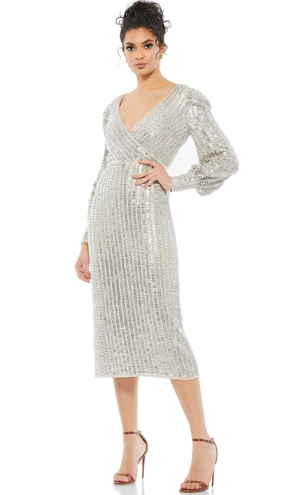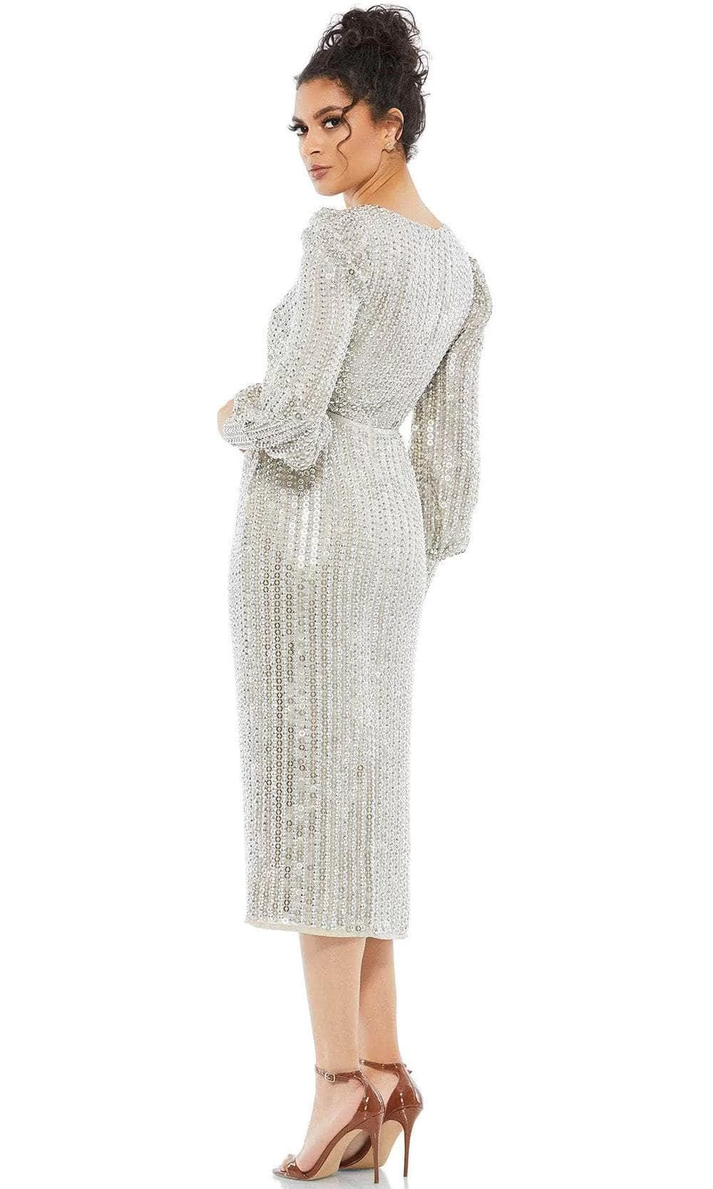 Sparkle with utmost elegance as you radiate a regal style in this Mac Duggal 10809 creation. Festooned with intricate beadworks all over, this ensemble flaunts a surplice V neckline and long bishop sleeves with button cuffs. A center zipper closure enclosed the full back. Nipped with a beaded thin belt, the fitted skirt runs down into a tea-length sheath silhouette. This Mac Duggal evening dress will let you shine like the star that you are. Model is wearing the Silver color.