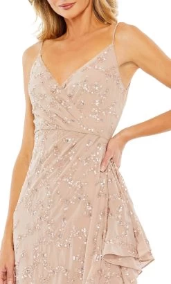 Emanate a style that would render them speechless in this Mac Duggal 10874 creation. Impressively bedecked with glimmering sequins all throughout, this sleeveless style flaunts a trendy surplice v-neckline, spaghetti straps and a backless design with a crisscross strap for support. The skirt reveals an A-line silhouette that cascades in high low hemline and finished with a asymmetric ruffled details. Get ready to shine in this fabulous Mac Duggal 10874 cocktail dress. Model is wearing the Mocha color.