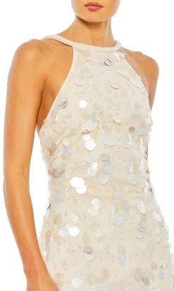 Resonate a sophisticated style all night long in this sexy Mac Duggal 10878 creation. Exquisitely crafted with a shimmering spectacle of paillettes, sequin clusters, and swingy beads, this dress flaunts a halter strap neckline with a cut-in bodice and a sultry low open back. Rendered with a touch of drama with its side slit, the sheath skirt columns beautifully as it perfects with a floor grazing hemline. Inspire the upscale crowd to take a gander at you in this Mac Duggal masterpiece. Model is wearing the Porcelain color.