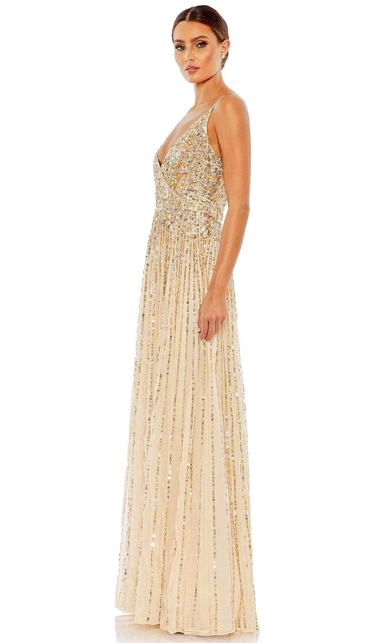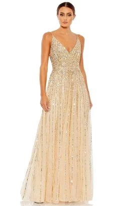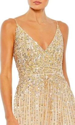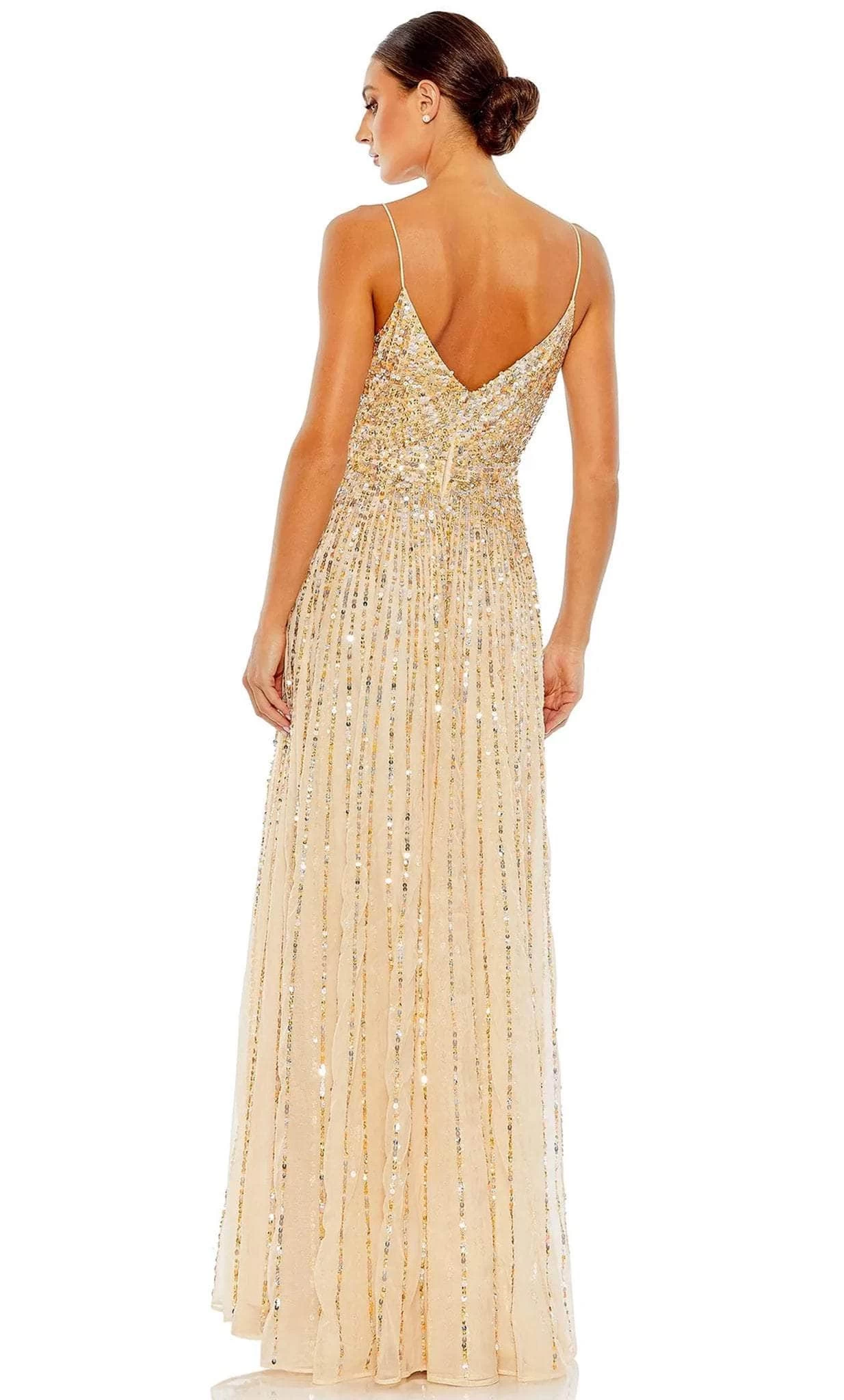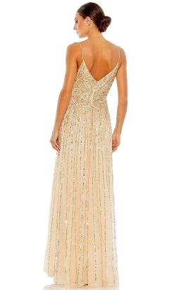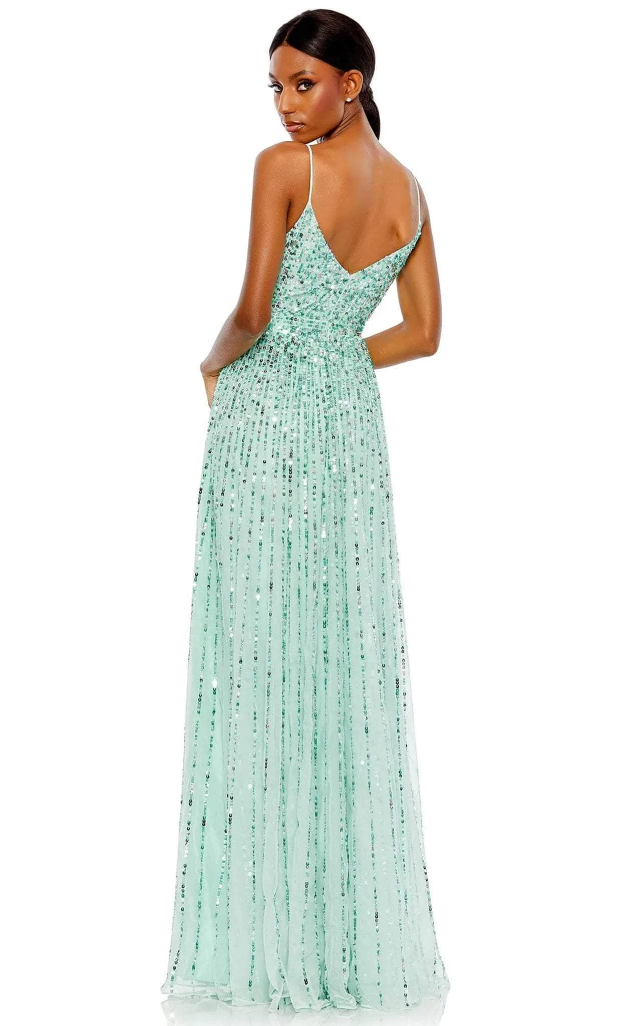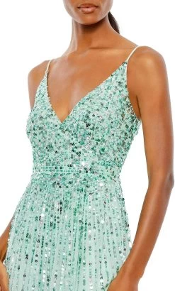 Make an extraordinary statement when you walk in this classy Mac Duggal 10928 gown. Showcasing a fit and flare bodice beautifully adorned with linear sequins, this style will leave a lasting impression at your next event. This sleeveless outfit features a mirrored v-neckline and v-back, with spaghetti straps that hold the bodice. The flowy skirt cascades to a full length A-line silhouette. Light up the night in this eye-catching Mac Duggal 10928 style! Models are wearing the Mint and Nude colors.
