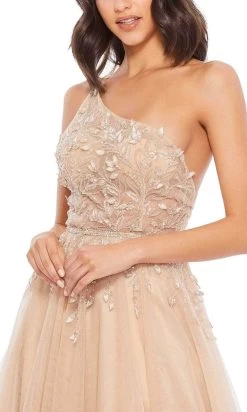 Show your sophisticated sense of style in this alluring evening dress by Mac Duggal 11210. Fashioned in a sleeveless one shoulder asymmetrical neckline, this stunner showcases a sheer bodice elegantly embellished with appliques and sparkling beads and sequins. A bareless back aesthetically secured in a single lace strap and a zipper closure. Framing the waist with a hand beaded belt, the A-line skirt cascades beautifully into a full length hem and ends with a sweep train. Take their breath away with this striking Mac Duggal masterpiece. Model is wearing the Nude color.