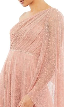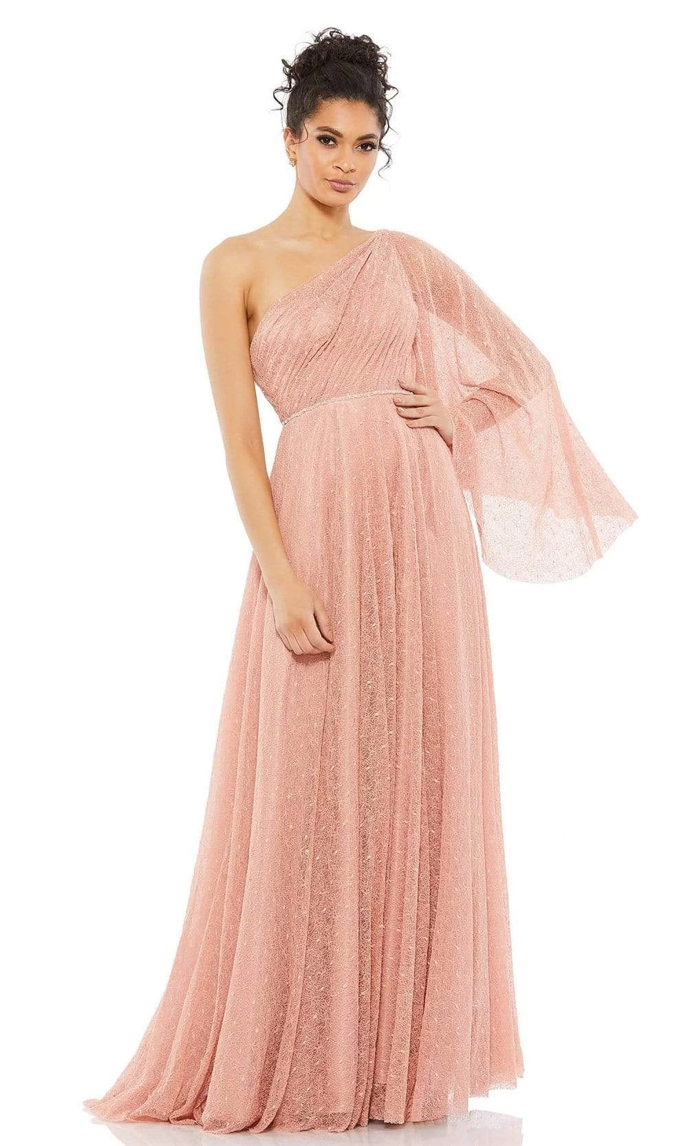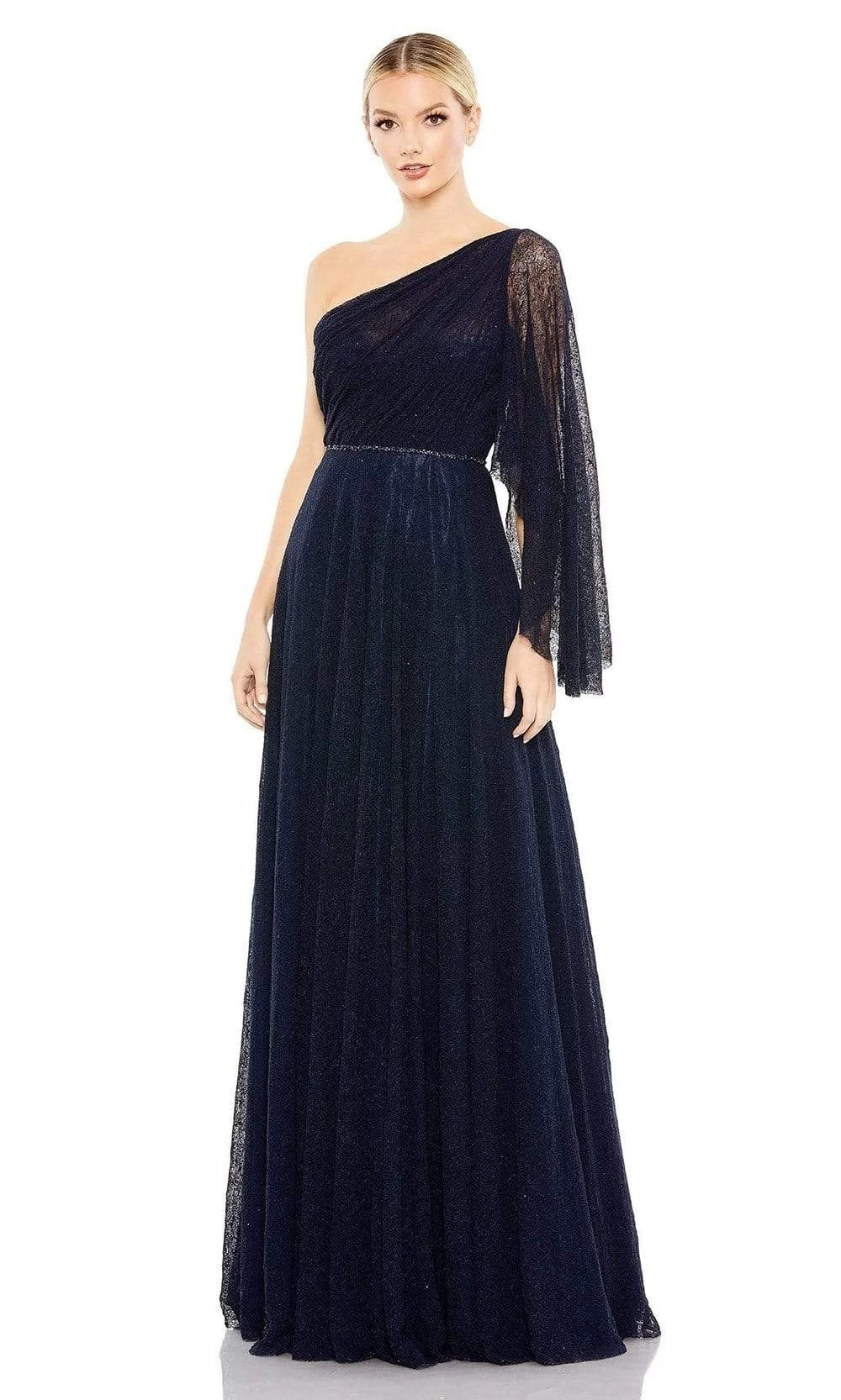 Turn yourself into a head-turning beauty by slipping into this absolutely eye-catching Mac Duggal Couture 1124 evening gown. Textured with a lace fabric sprinkled with beads throughout the bodice, this charming piece shows an asymmetric neckline and one shoulder long bell sleeve with a ruched bodice which complements the look. Revealing an open back, this look is secured with a back zipper closure. A beaded thin belt highlights the natural waist. The A-line skirt slides and flares into a full length hemline with a sweep train. Clothe yourself in an alluring perfection that would capture a fairy tale you are dreaming of in this Mac Duggal creation.