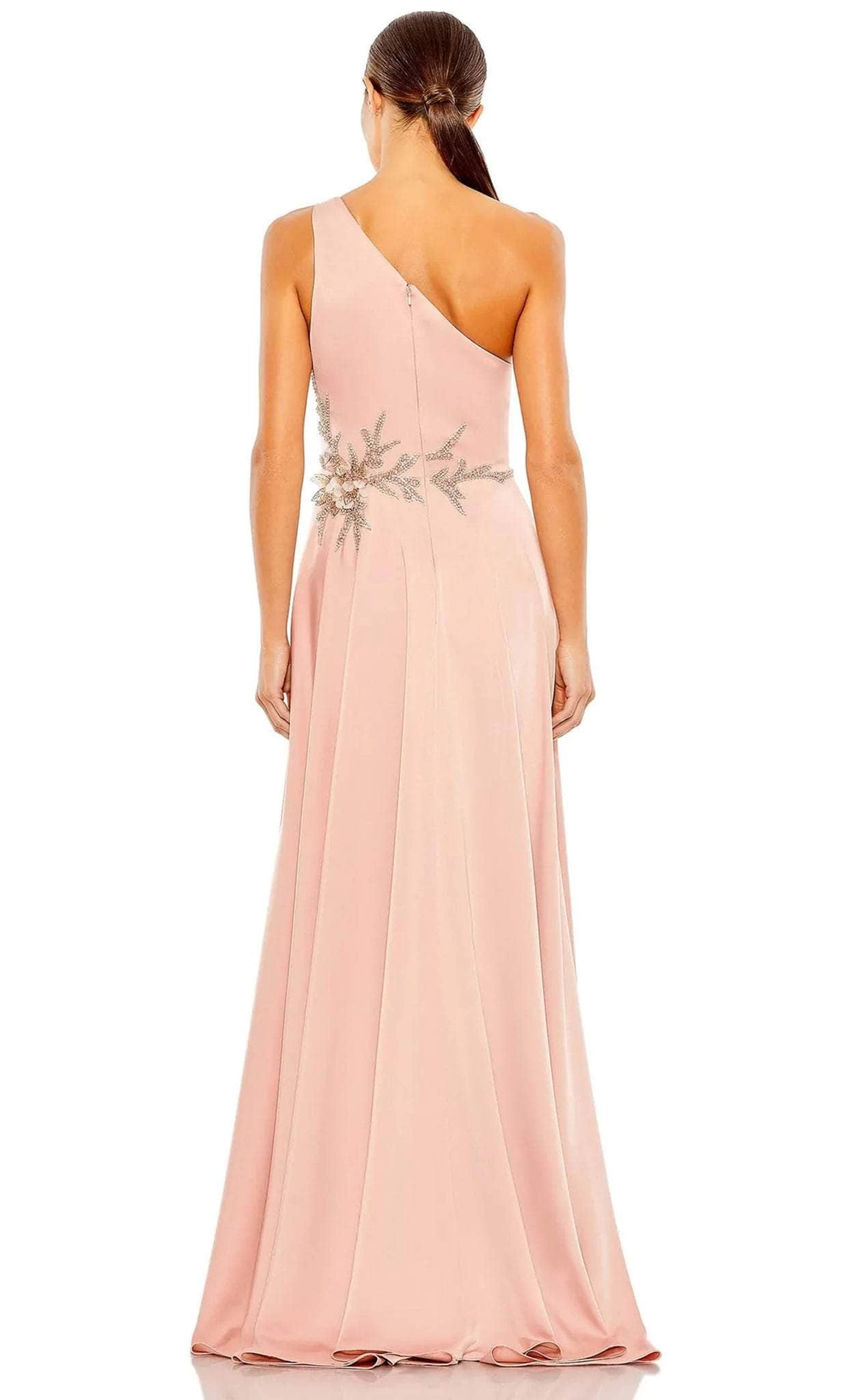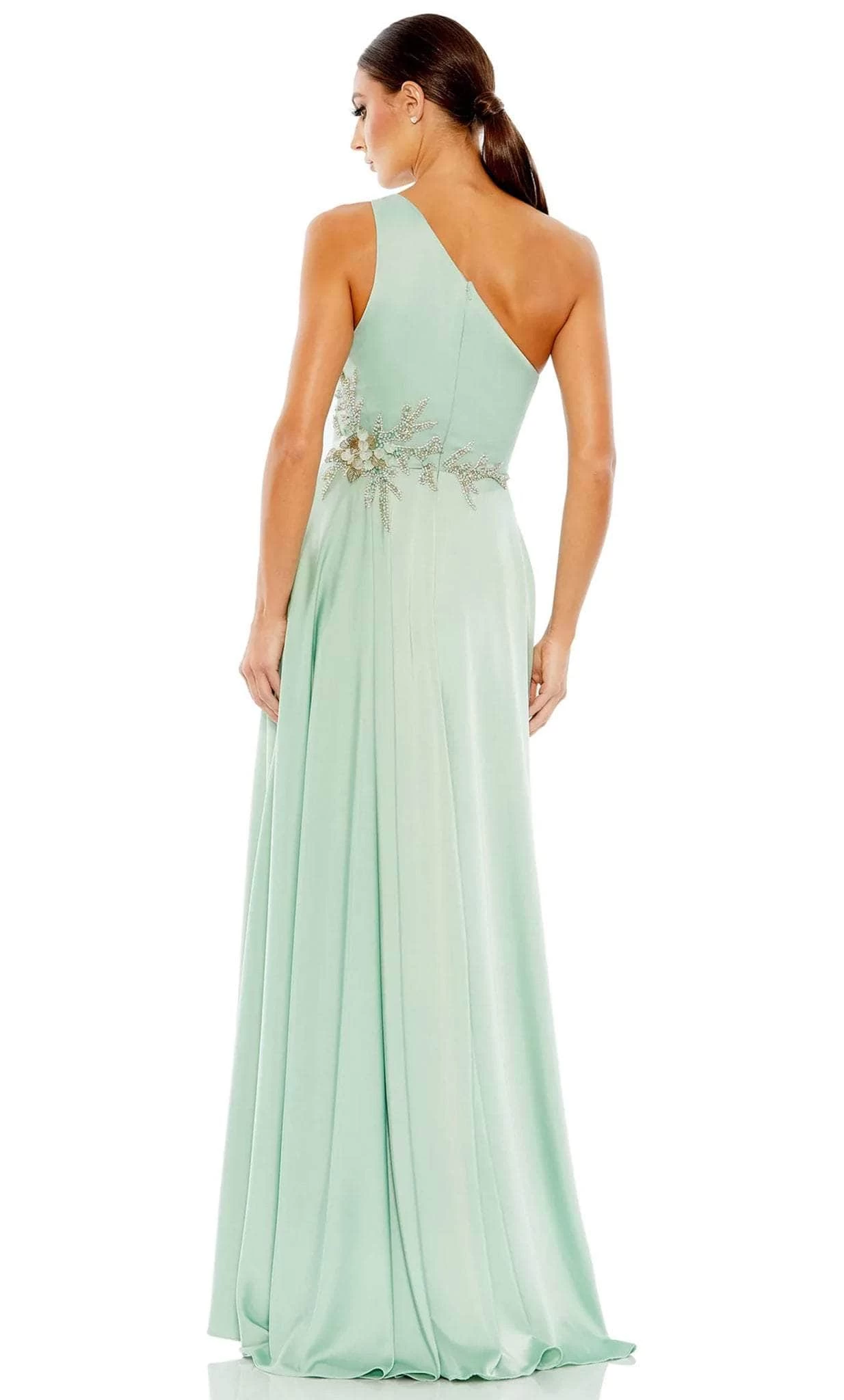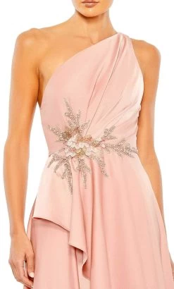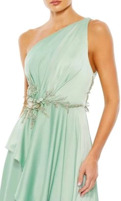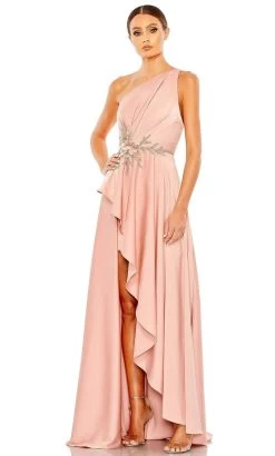 Make it your moment to stand out wearing this Mac Duggal 11262 creation. This timeless elegant piece features an asymmetrical neckline, single wide strap and slanted mid-open zippered back. Highlighted with beaded appliques and ruching, the A-line skirt flares smoothly into a high low hem with ruffled detailing and a high-leg slit. This Mac Duggal 11262 gown is specially designed to make that special occasion worth reminiscing. Models are wearing the Rose and Sage colors.