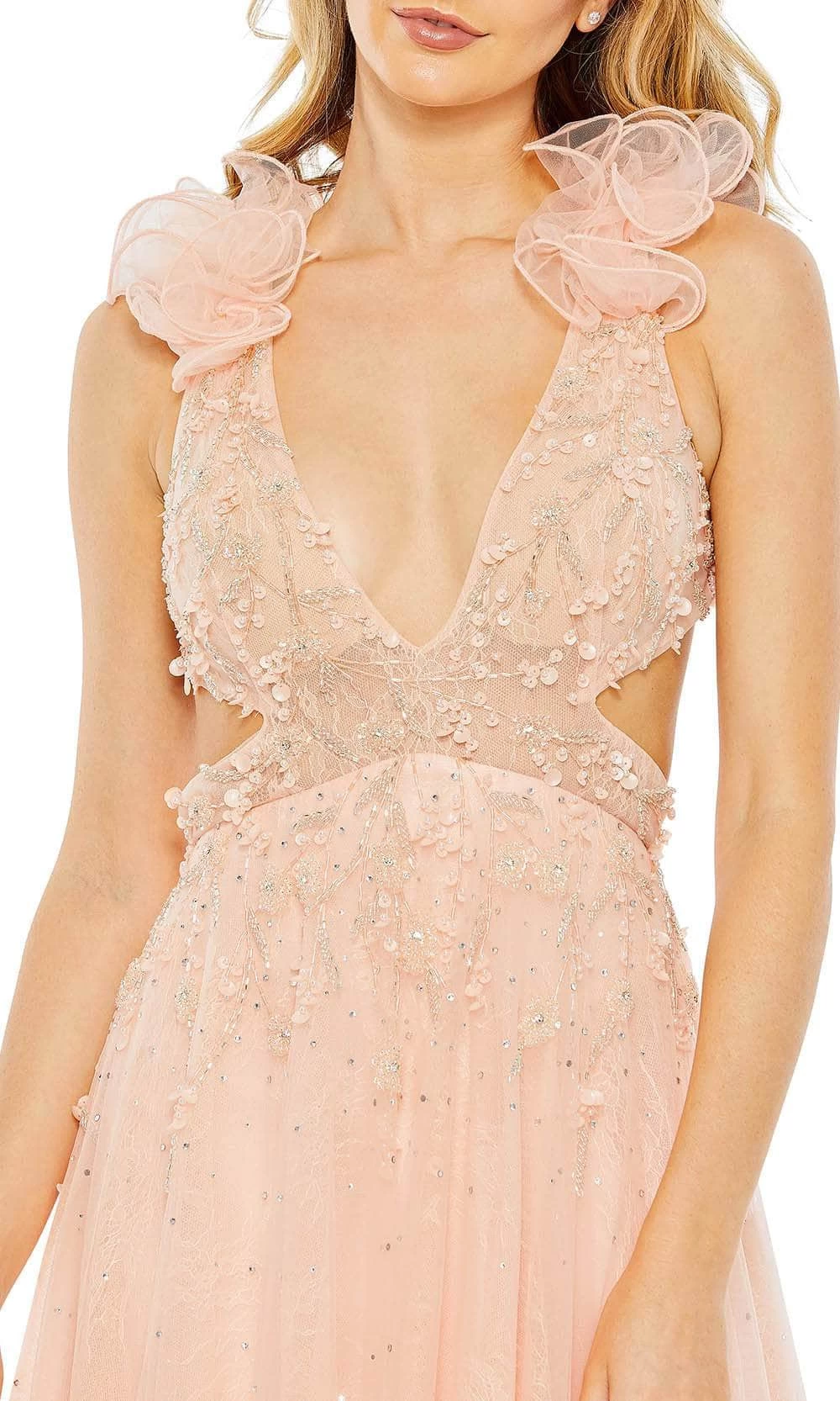 Demand undivided attention at your glamorous affair in this beautiful Mac Duggal 11269. Shimmering with beads and sequin accents all over the dress, this stunning piece features a sleeveless sheer fitted bodice with a plunging V-neckline and ruffled shoulder straps. Alluring side cutouts complimented the open back with a lace up tie and secured with a zipper closure. The A-line skirt trickles down into a floor-length hem. Reveal that inner goddess in you in this Mac Duggal masterpiece. Model is wearing the Peach color.