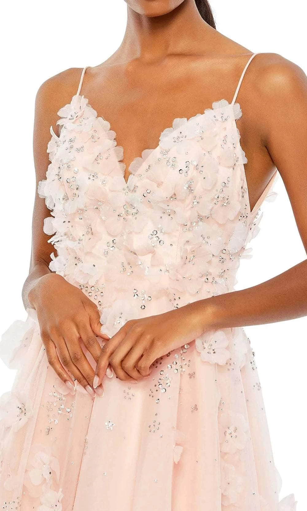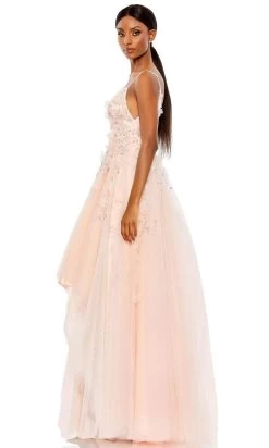 Bloom with loveliness in this detailed creation from Mac Duggal 11292. The eye-catching dress is fully embellished with 3D floral lace applique and effervescent rhinestones that make you look gorgeous. It showcases V-neckline and a V-shaped open back with concealed zipper closure. The tulle skirt is in a high low hem, forming an A-line silhouette. Embrace a style that is immaculately sultry as you glam up for your event in this Mac Duggal 11292 masterpiece. Model is wearing Petal color.