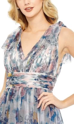 Be the delight of everyones eyes in stunning Mac Duggal 11332 dress. This fully lined dress features a flattering V-neckline, sleeveless design, and concealed back zipper for a seamless finish. The tiered ruffled skirt is the perfect complement to the ruched waistband, which sits at the empire waist for a flattering silhouette. The beautiful floral print is accentuated by charming bow appliques on the shoulder, making this dress perfect for any occasion. This Mac Duggal 11332 masterpiece will definitely bring out the Queenly in you! Model is wearing the Blue Multi color.
